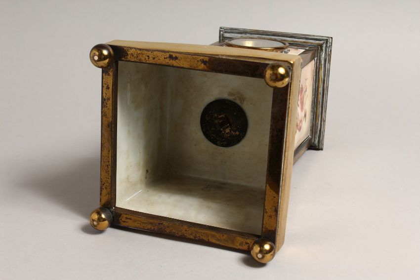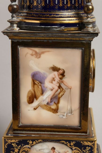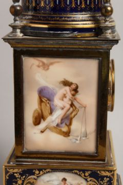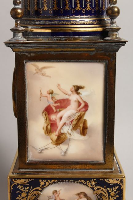 A SUPERB 19TH CENTURY VIENNA SQUARE SHAPED CLOCK with porcelain panels, blue and gilt ground, the panels painted with cherubs and classical figures with domed top and circular dial, on ball feet.
