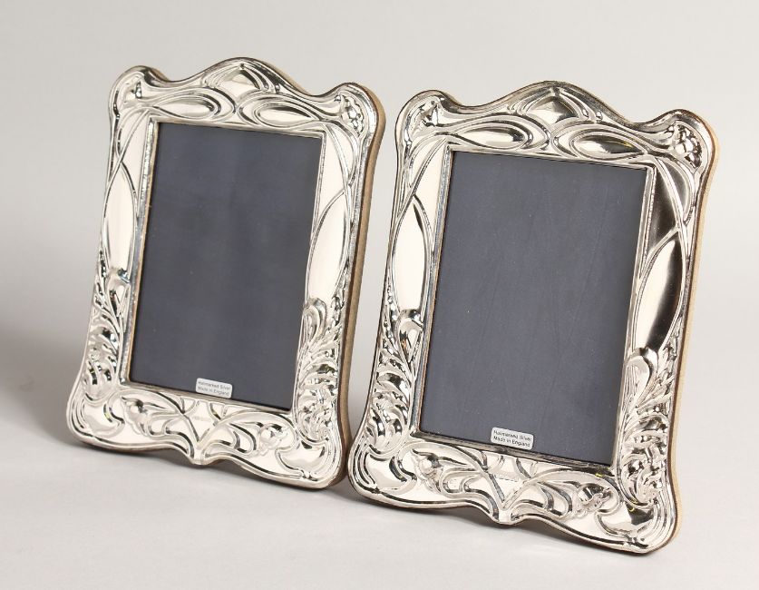A PAIR OF SILVER ART NOUVEAU STYLE PHOTOGRAPH FRAMES.
