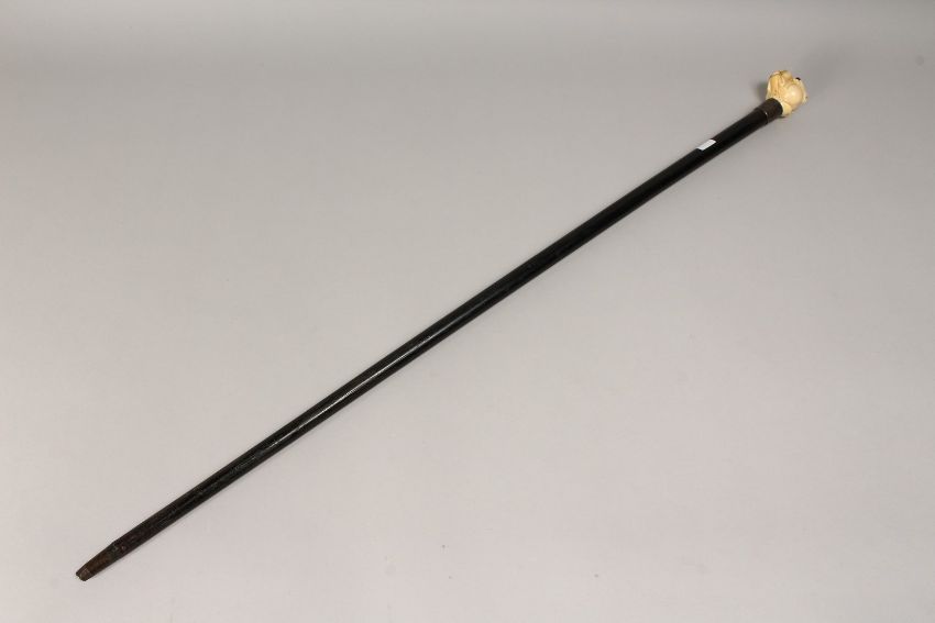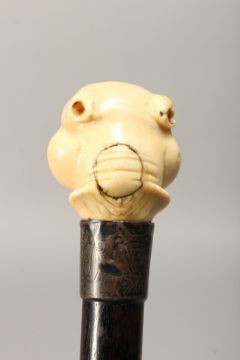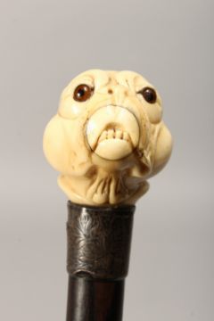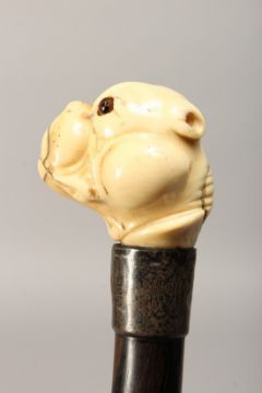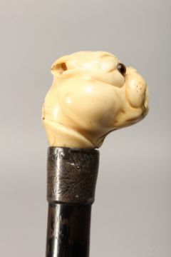 A 19TH CENTURY CARVED IVORY BULL DOG HANDLE WALKING CANE with engraved silver band