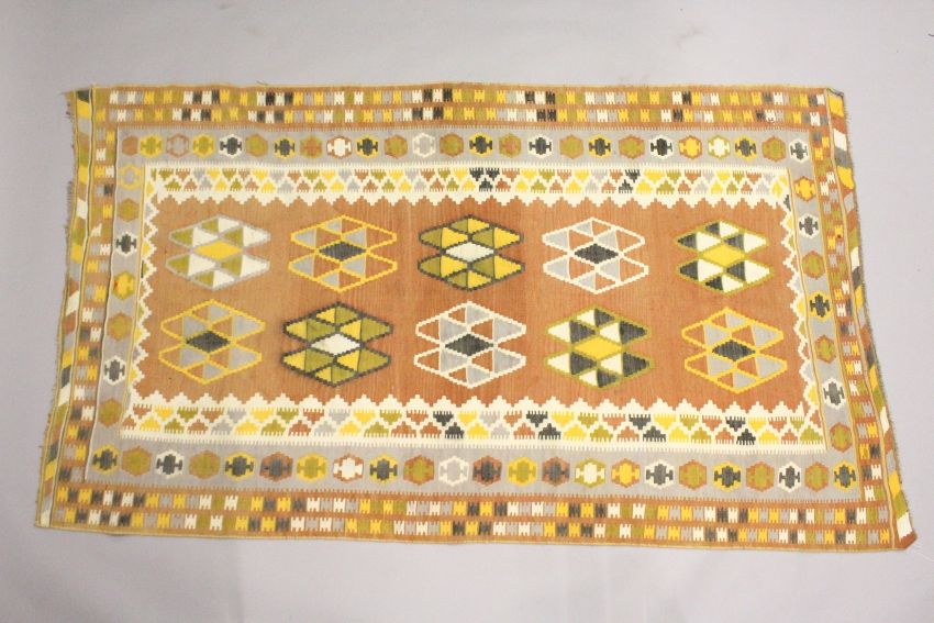 A PERSIAN KELIM CAPET, orange ground with typical geometric decoration