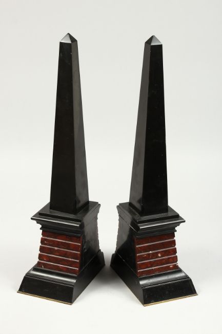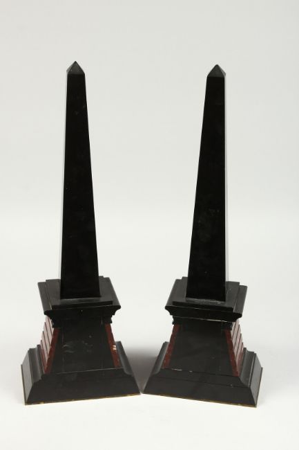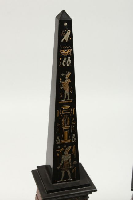 A VERY GOOD PAIR OF EGYPTIAN MARBLE OBELISK with Egyptian figures and hieroglyphs.