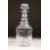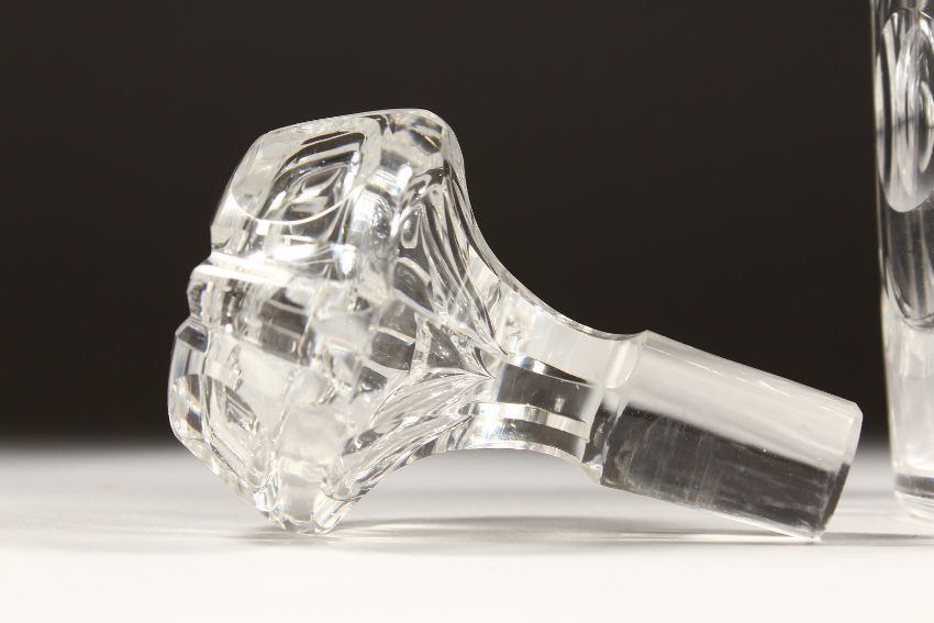 A HEXAGONAL CUT GLASS DECANTER AND STOPPER.
