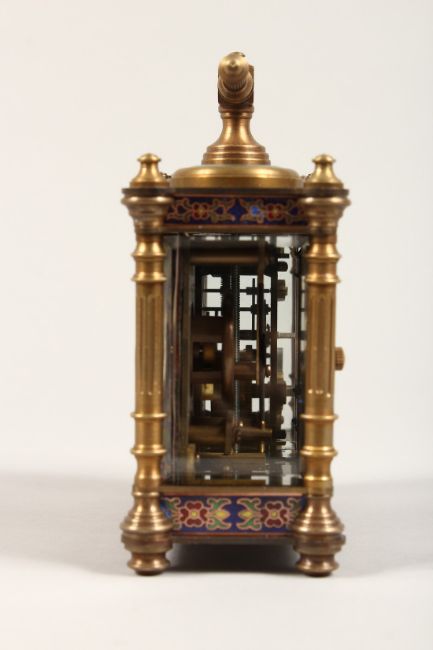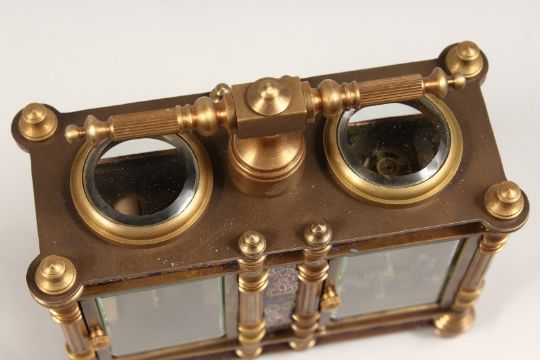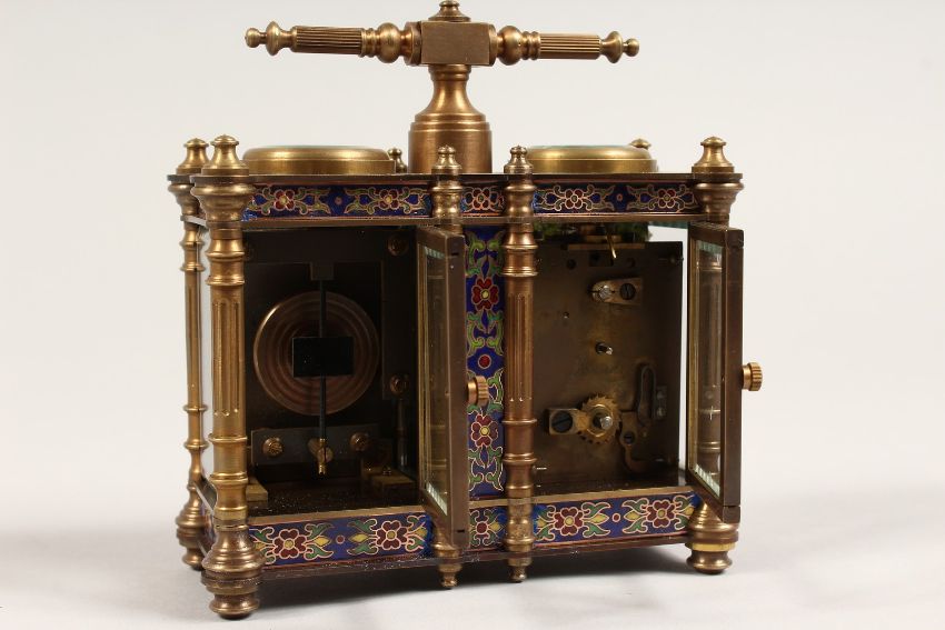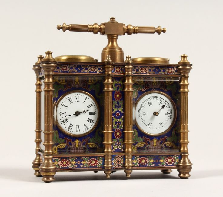 AN UNUSUAL BRONZE AND CHAMPLEUVE ENAMEL DOUBLE CARRIAGE CLOCK / BAROMETER.