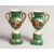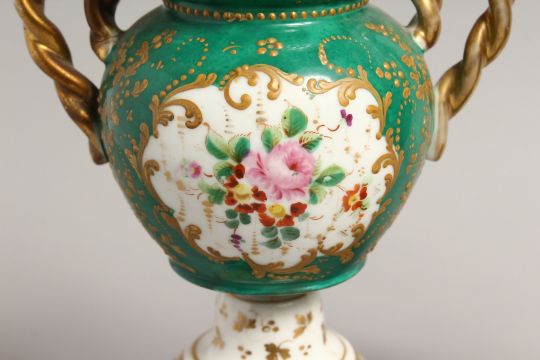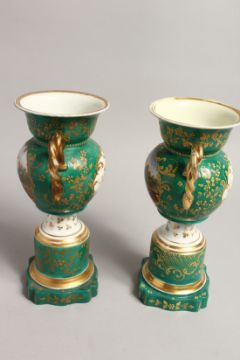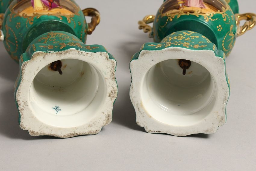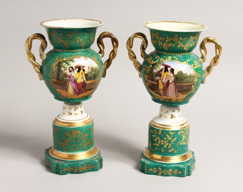 A PAIR OF 19TH CENTURY PARIS GREEN GROUP TWO HANDLED URNS with reverse panels of figures and flowers