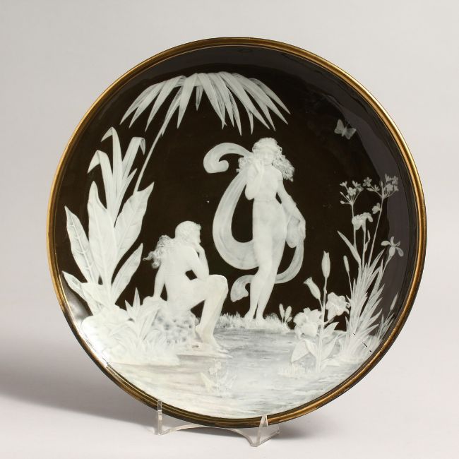 A GOOD PATE SUR PATE CIRCULAR DISH with classical figures in relief, beside a pool.