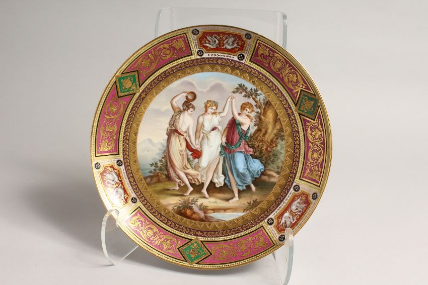 A SUPERB 19TH CENTURY VIENNA CIRCULAR PLATE with high quality painting and gilding. The centre painted with The Three Muses.