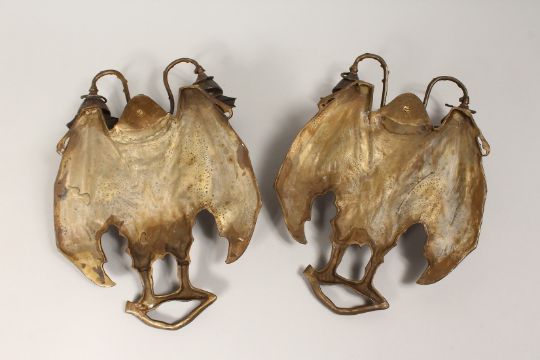 AN UNUSUAL PAIR OF CAST BRONZE BAT SHAPED TWIN LIGHT WALL SCONSES.