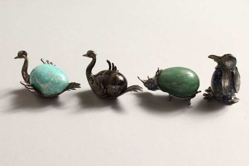 FOUR SILVER MOUNTED `PENGUIN, RHINO, AND TWO SWANS'