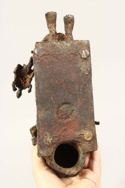A TRIBAL BRONZE GROUP POSSIBLY, BENIN, two figures, one holding a turtle,the other a knife