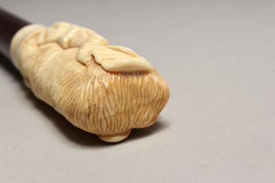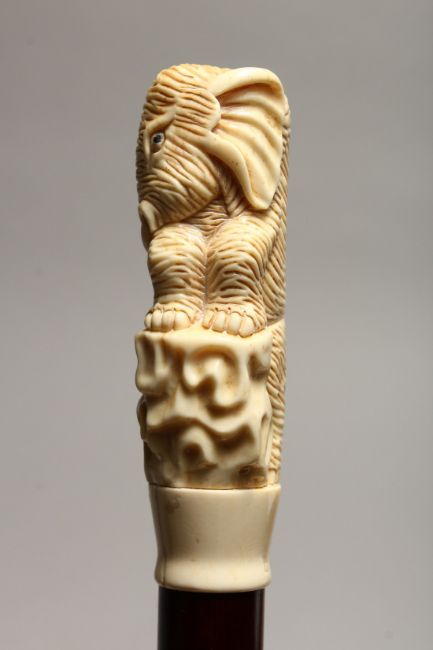 A WALKING STICK WITH CARVED BONE HANDLE, modelled an elephant.