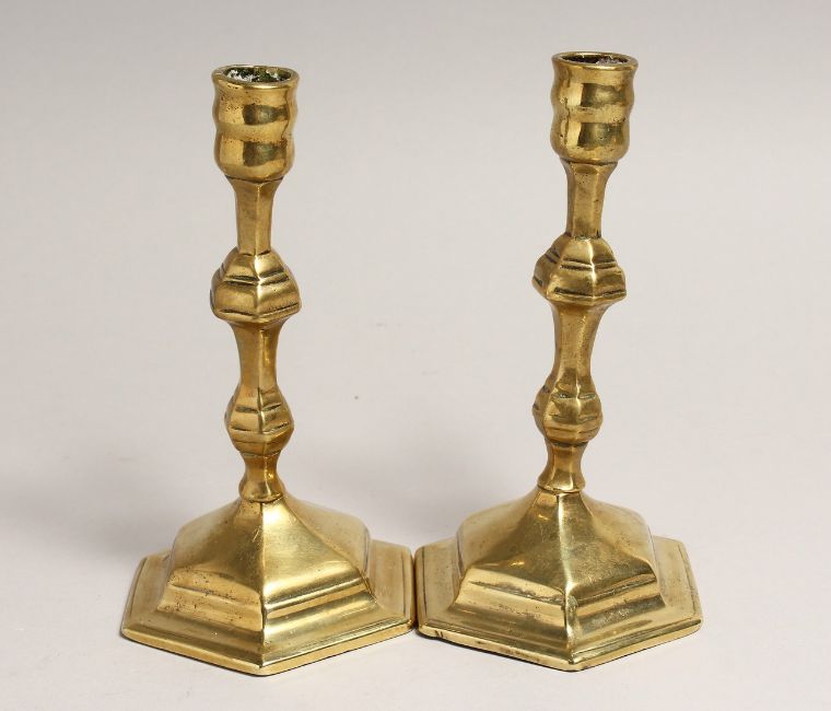 A PAIR OF 18TH CENTURY BRASS CANDLESTICKS on hexagonal bases