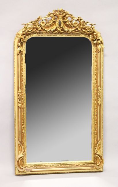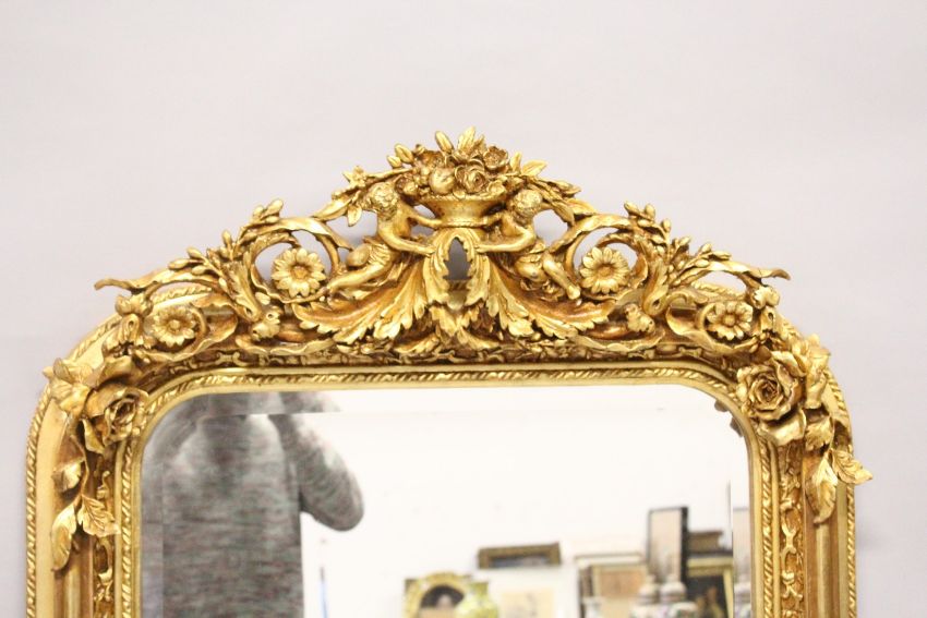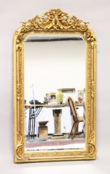 A LARGE ORNATE GILT FRAMED ARCH TOP MIRROR, the top with cherubs holding a basket of flowers