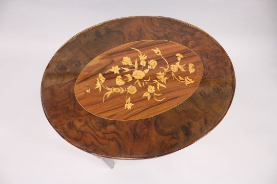 A FRENCH STYLE MARQUETRY INLAID OVAL TABLE on tapering square legs