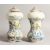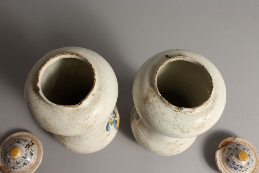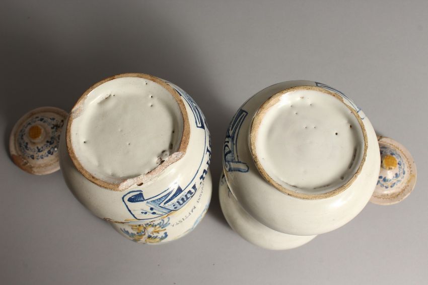 A PAIR OF ITALIAN MAJOLICA SPICE JARS AND COVERS painted with figures in blue and yellow.