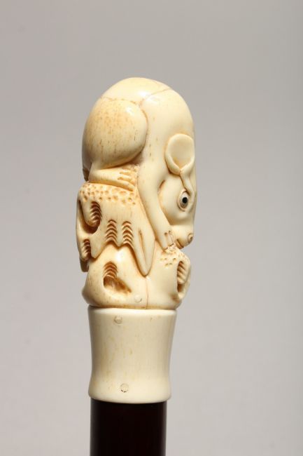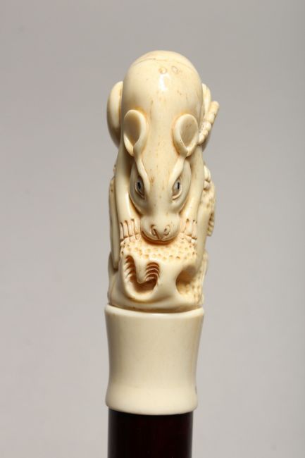 A NOVELTY WALKING STICK, with carved bone handle modelled as a rat.