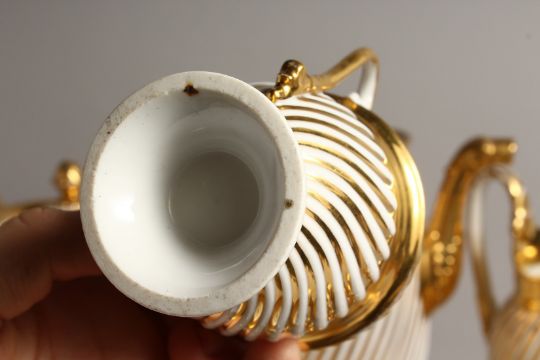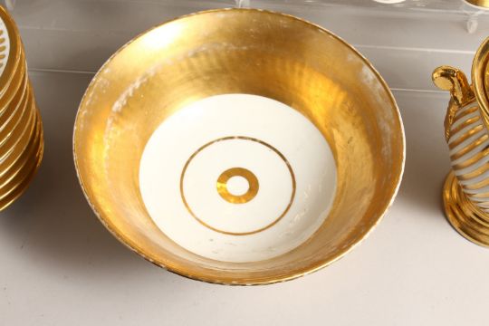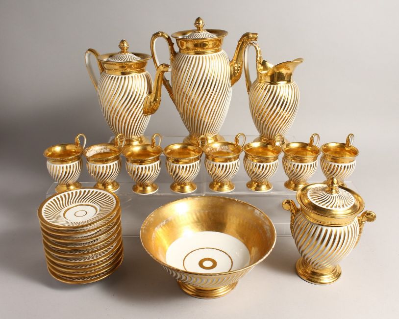 A GOOD PARIS GILDED TEA SET, comprising eight cups and nine saucers, tea pot, coffee pot, sugar bowl, milk jug and slop bowl.
