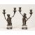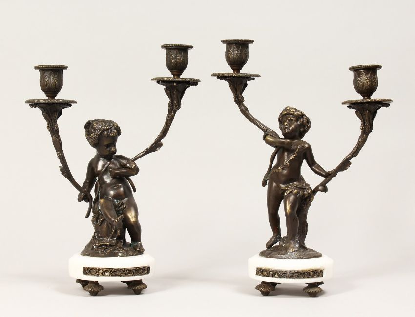 A PAIR OF FRENCH STYLE BRONZE CHERUBS AND MARBLE TWIN BRANCH CANDELABRAS.