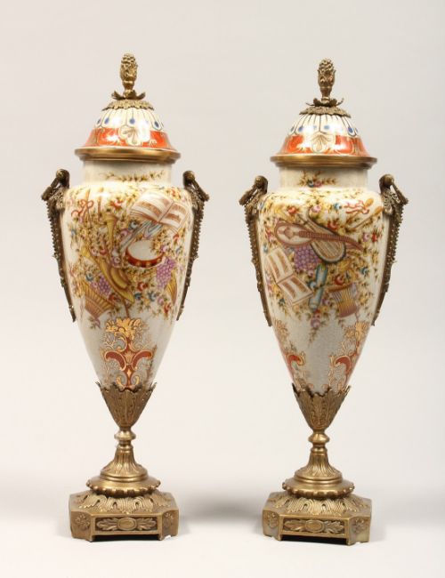 A PAIR OF PORCELAIN AND ORMOLU MOUNTED VASES AND COVERS, in the Sevres style.