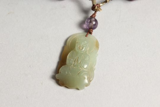 A 19TH CENTURY CHINESE QING DYNASTY CARVED JADE PENDANT NECKLACE with Touraline beads.