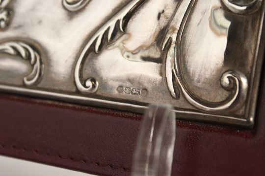A MAROON LEATHER DESK BLOTTER, the cover with embossed silver panel.