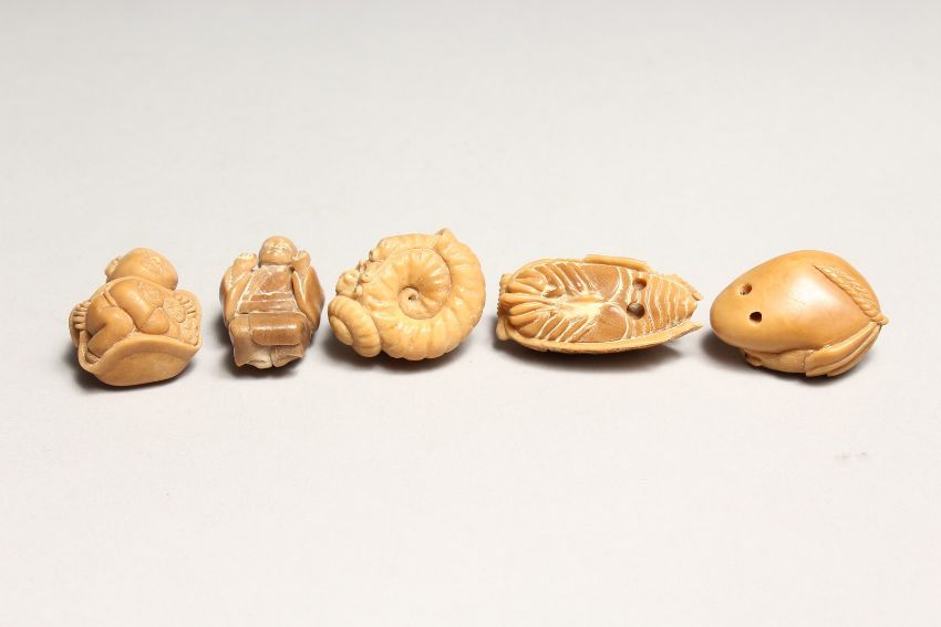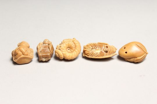 FIVE JAPANESE CARVED BONE NETSUKE.