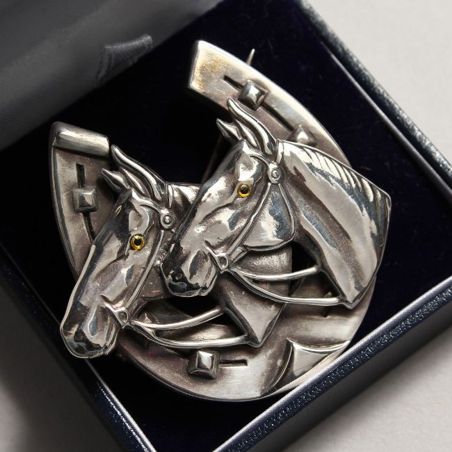 A LARGE SILVER DOUBLE HORSE AND SHOE HORN BROOCH