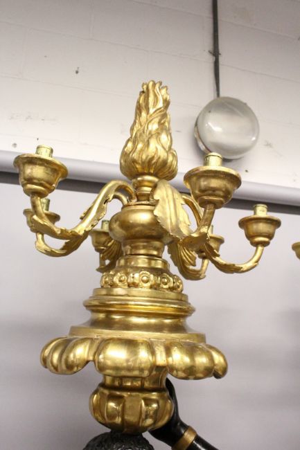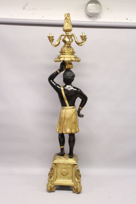 A SUPERB LARGE PAIR OF 19TH CENTURY STANDING NUBILE FIGURE CANDELABRAS formed as a a pair of African figures with six branches, with flame finials, standing on a super pedestal with acanthus scrolling legs.