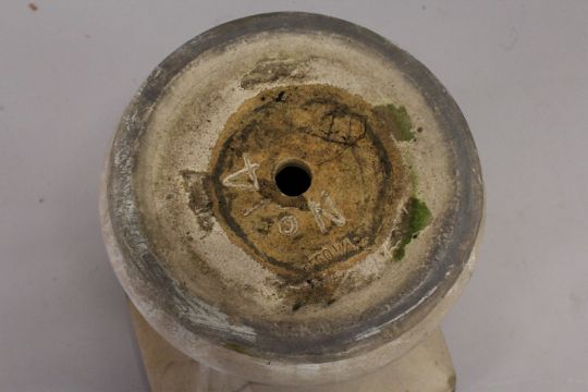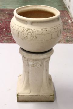 A LEEDS FIRE CLAY LEFCO WARE, STONE WARE JARDINIERE AND STAND, the ovid bowl with scrolls