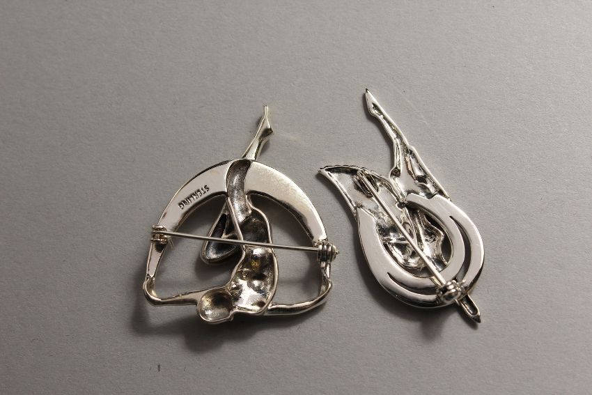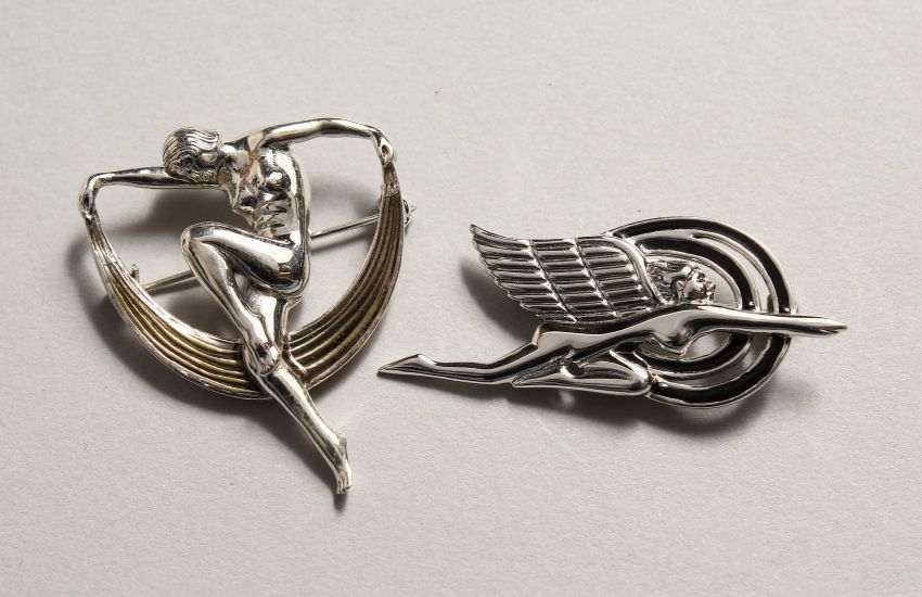 TWO SILVER ART DECO DESIGN LADY BATHERS BROOCHES.