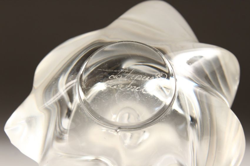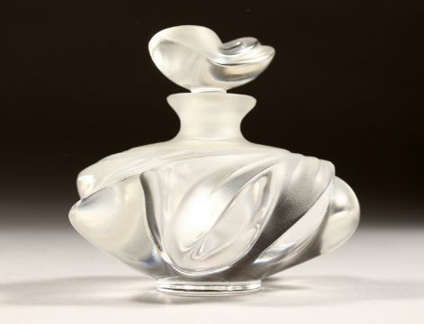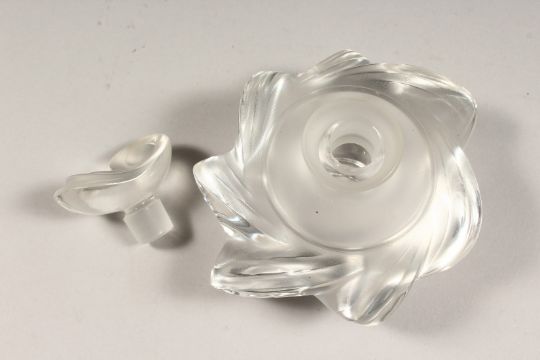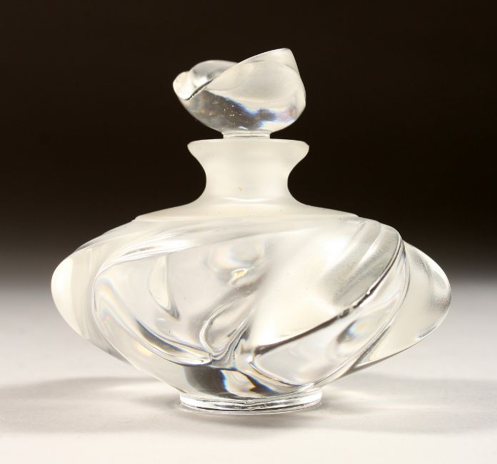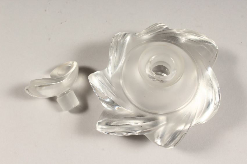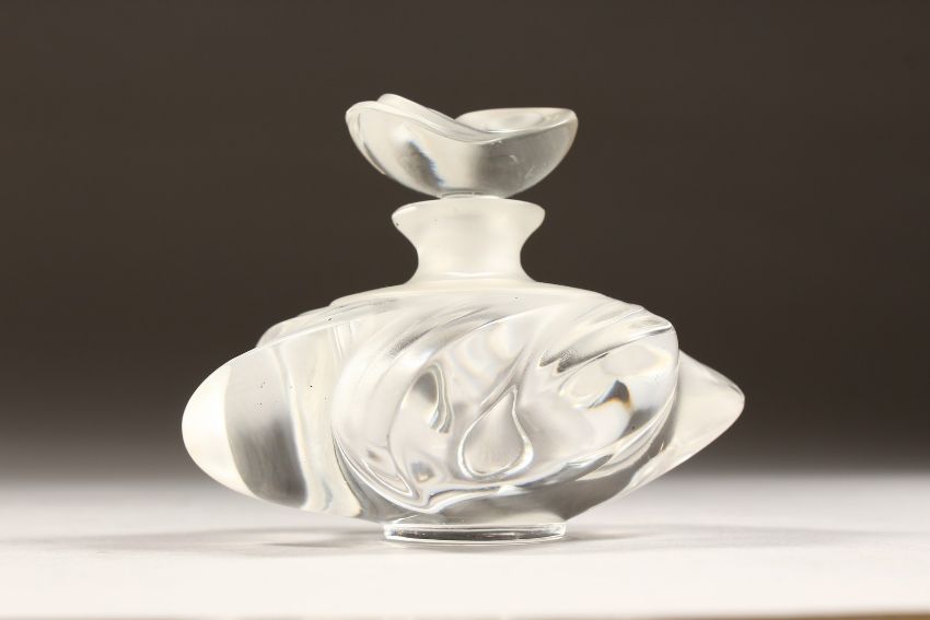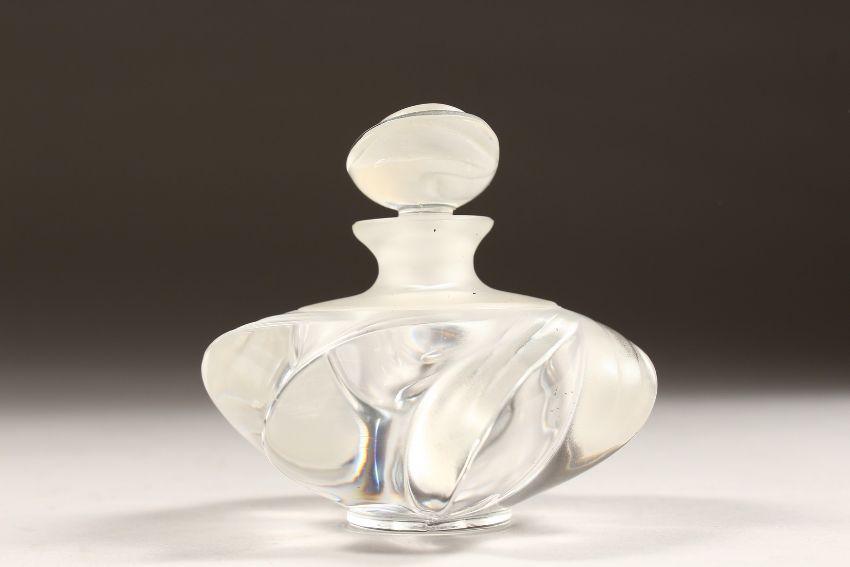 A LALIQUE GLASS SCENT BOTTLE with stopper, engraved Lalique, France. 3ins high