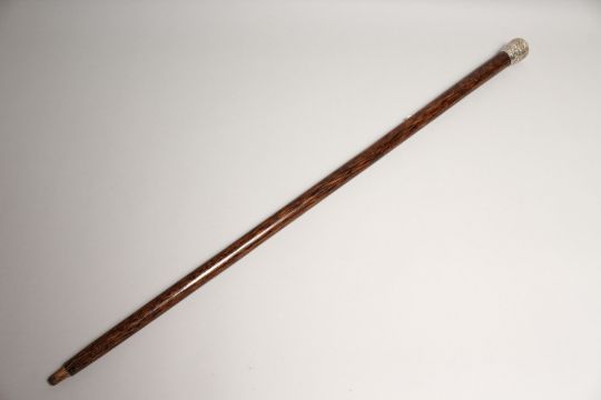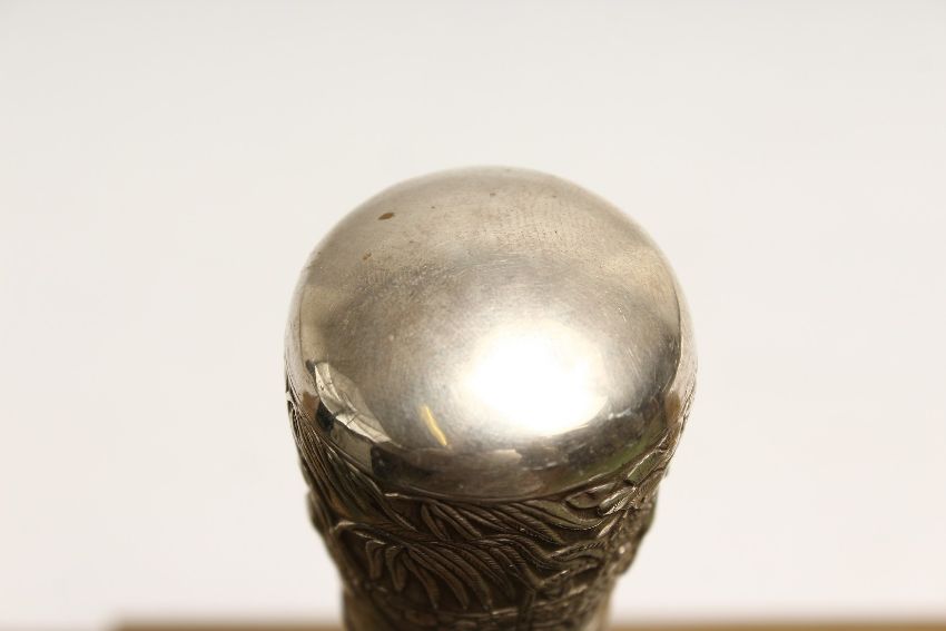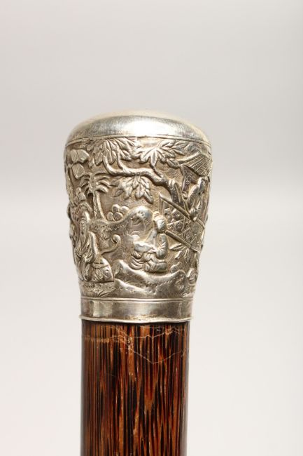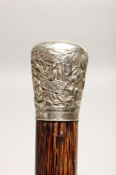 A VERY GOOD 19TH CENTURY CHINESE SILVER TOP WALKING CANE.