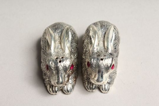 A PAIR OF .800 SILVER PLATED RABBIT SALT AND PEPPERS