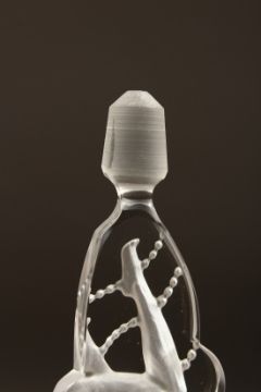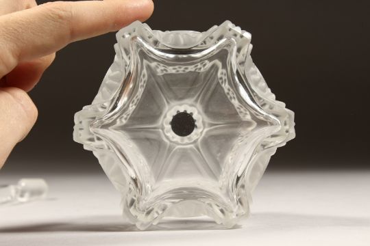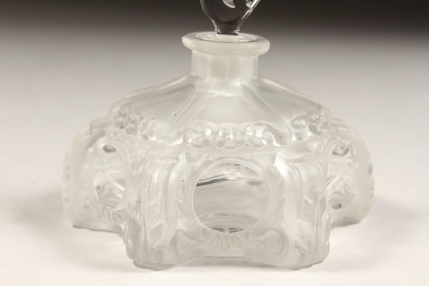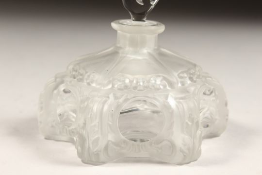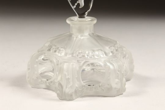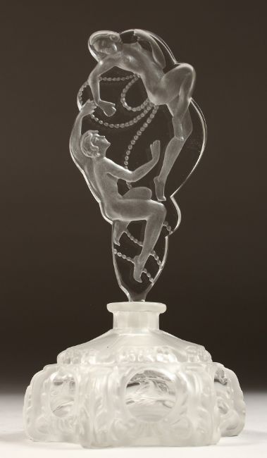 A GLASS SCENT BOTTLE AND STOPPER IN THE LALIQUE STYLE, the elongated stopper engraved with two frolicking nudes.