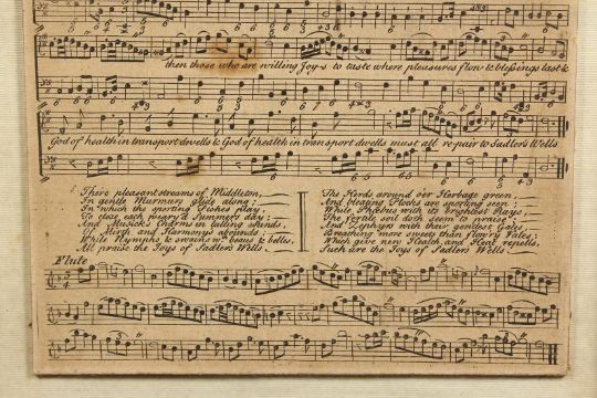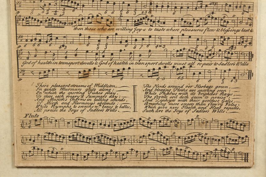 A FRAMED AND GLAZED PIECE OF MUSIC " A NEW SONG ON SADLERS WELLS" set by M. BRETT.