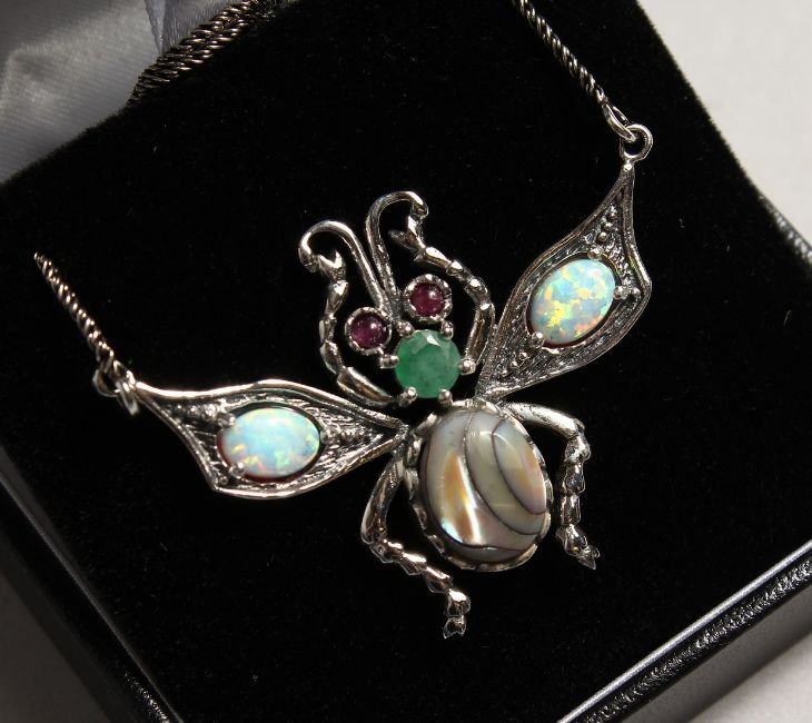 A PAIR OF SILVER OPAL SET BUTTERFLY PENDANT and chain