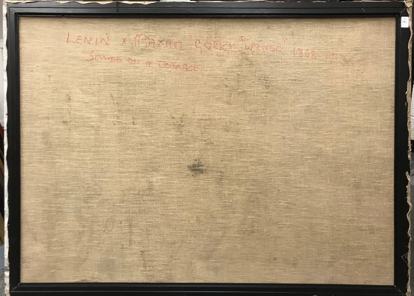 20th Century Russian School, Lenin and Gorky conversing on a terrace, oil on canvas, inscribed verso, 35 x 47.75, unframed.