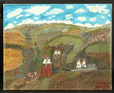 Fred Yates (1922-2008) British, A view of oast houses with fields and hills beyond, oil on canvas, signed, 24" x 30", (unframed).