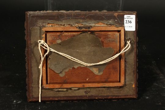 After Franz Von Defregger (1835-1921) Austrian, 'The Storey Teller', interior scene with figures gathered at a table, oil over a print base, on mahogany panel, with stamp, 4" x 5.5".