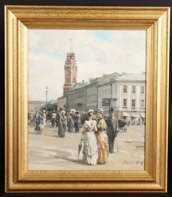 Dmetri Yevgrafov (b.1967) Russian, 'On Nevsky Avenue in St. Petersburg', signed, oil on canvas 17.35" x 14.5", 44x37cm.