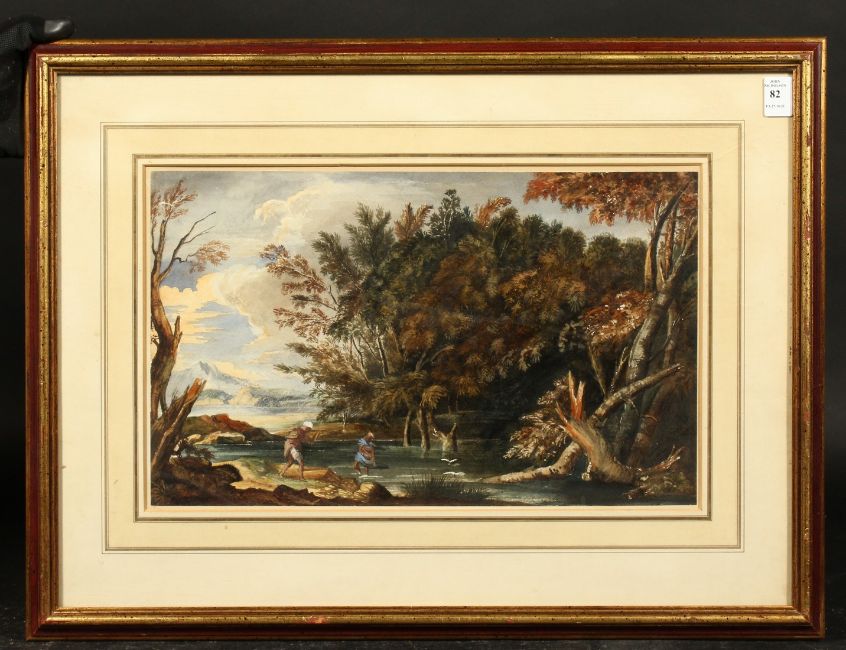 Follower of Salvator Rosa (late 18th Century) Mercury and the dishonest woodsman (After the painting in the National Gallery, London) watercolour with body colour and scratching out, indistinctly signed, 10.5" x 17.25". Provenance: Anonymous Sale, Bonham's, Bond Street, Old Master Pictures, 09.04.2003, Lot 153 (As 'Follower of Salvator Rosa').