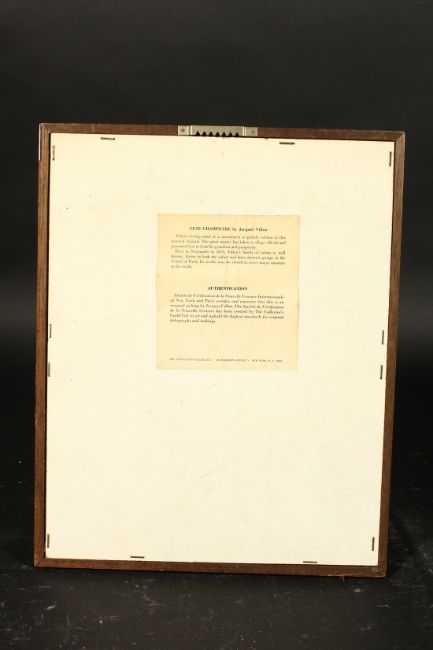 Jacques Villon (1875-1963) 'Fete Champetre', etching with Collectors Guild label verso. 8.75" x 3.5".