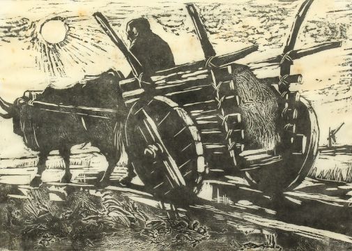 20TH Century School, circa 1965, 'Bydlow, The Polish Ox Cart, Series II', woodblock, inscribed and indistinctly signed, 14" x 19.5".