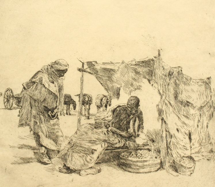 Erich Wolfsfield (1885-1956) German, A North African scene of wayfarers buying provisions, etching, signed in pencil, 12" x 13.5".