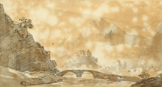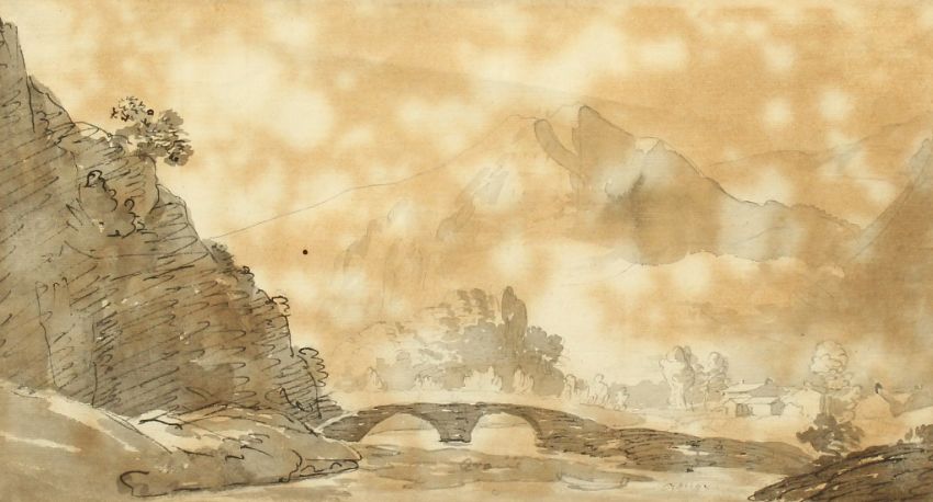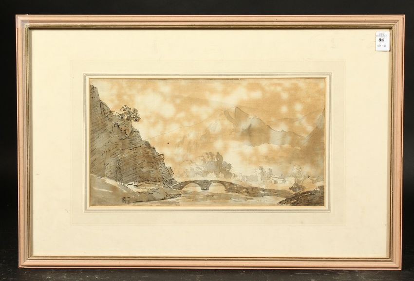John Warwick Smith (1749-1831) 'Grange Bridge towards Borrowdale', pencil, pen and wash, inscribed on reverse of paper, 8.5" x 15.5".