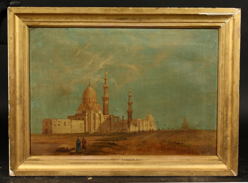 Circle David Roberts (1796-1864) A Temple scene with figures and a Camel train, oil on canvas, bears signature, 12.75"x 19".