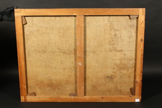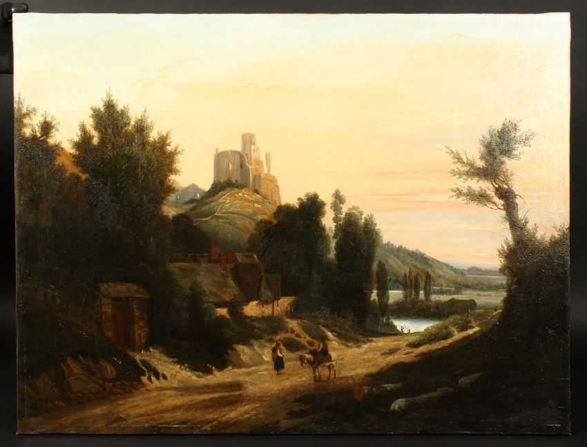 19th Century, probably Continental School, Wayfarers conversing on a path below hilltop ruins, oil on canvas, bears signature, 28.75" x 37.5", (unframed).