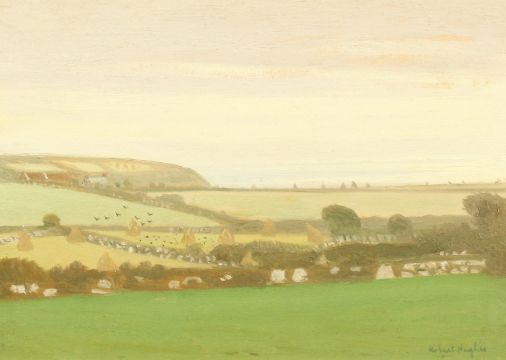 Robert Morson Hughes (1873-1953) British, Open fields with a coastal view beyond, oil on board, signed, 10" x 14".