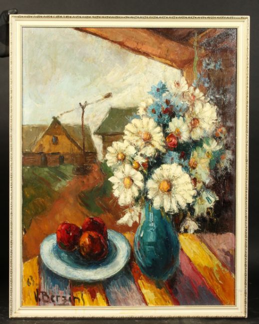 Valter Berzins (1925-2009), A still life study of mixed flowers and apples with buildings beyond, oil on canvas, signed and dated 63, 31.5" x 24".