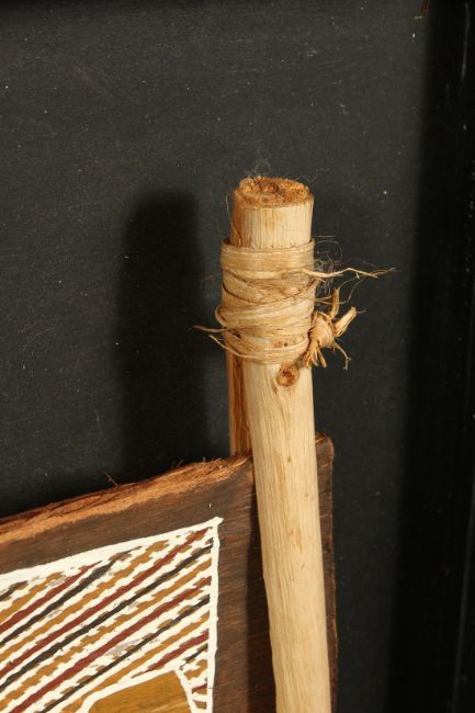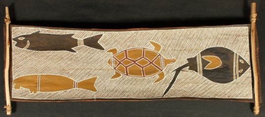 Aboriginal School, 20th Century, Depictions of animals on a natural wood panel, mixed media, 12" x 41".
