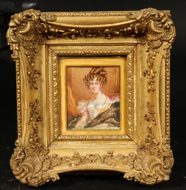 Early 19th Century, A pair of watercolour on ivory portraits of a lady and a gentleman, in fine gilt composition frames, 4" x 3.5", (2).